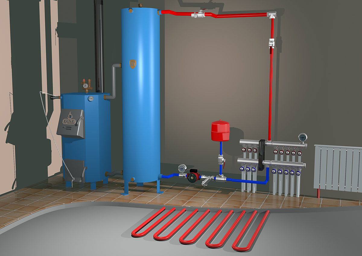 Котел «Казак» соединен через емкостной гидравлический разделитель с закрытой системой радиаторного отопления и теплых полов и принудительной циркуляцией. В случае, если не требует приготовление горячей воды, схема собирается без установки бойлера.